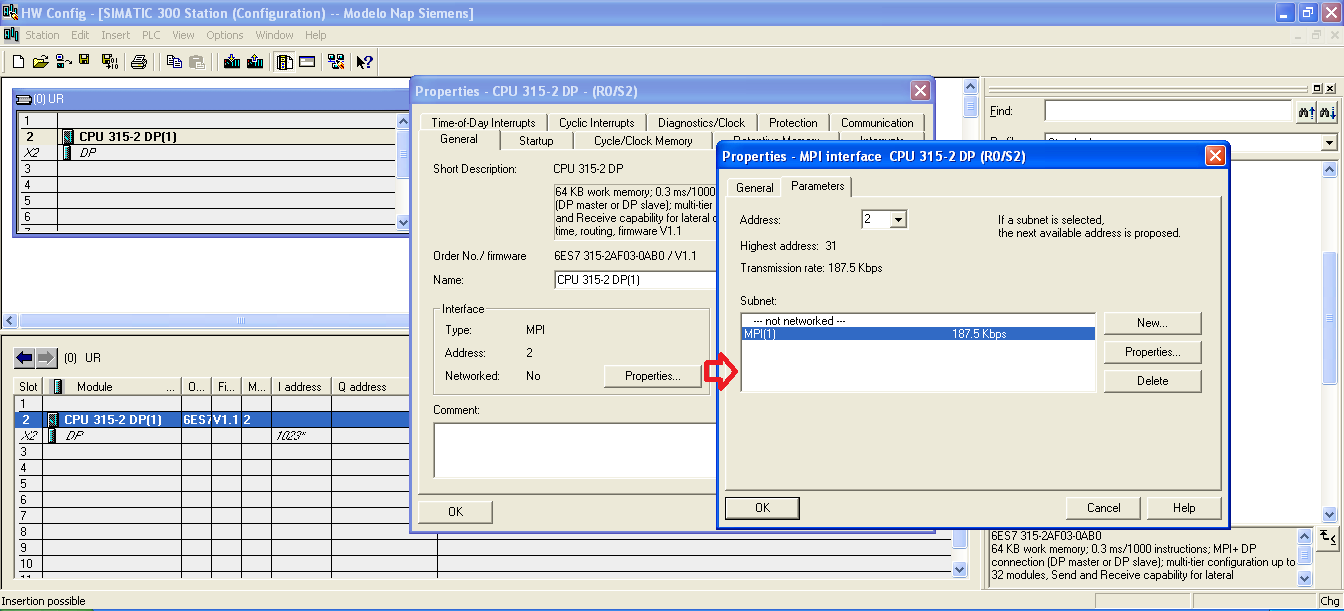 Selecionando CPU 315-2 DP(1) pode se abrir a tela de Propriedades (Properties), como se segue abaixo: