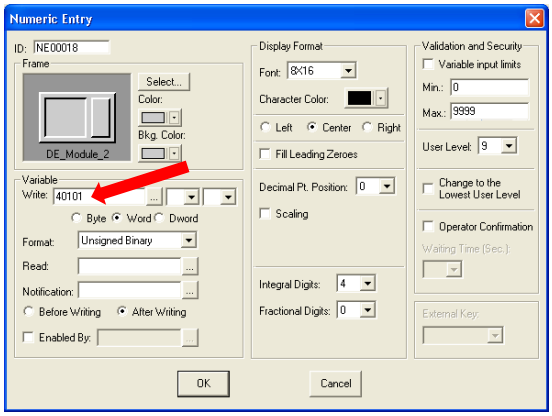 • Preencher com os parâmetros corretos e clicar em OK. No exemplo foi utilizado o endereço 1001 que corresponde a entrada digital X0 do FBs.