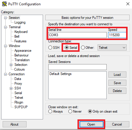 Abaixo, figura com as configurações realizadas no PuTTY: