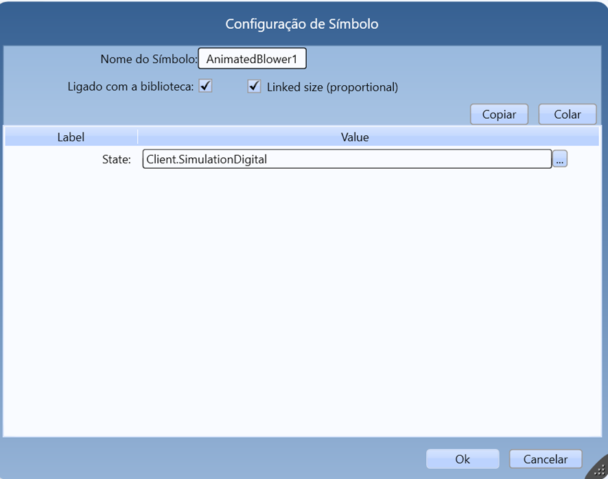 Por meio de um duplo clique no soprador podemos acessar suas propriedades. No parâmetro “State” foi vinculado uma tag interna de simulação do BluePlant.