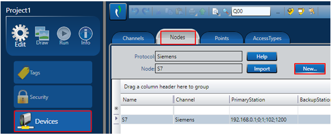 Após configurar o canal de comunicação, vamos adicionar e configurar o nó de comunicação. Para isso, na aba Nodes de Devices, clique em New.