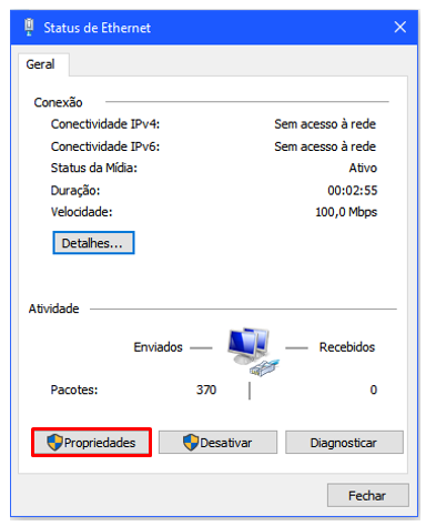 Na janela de status da porta Ethernet, clique em Propriedades.