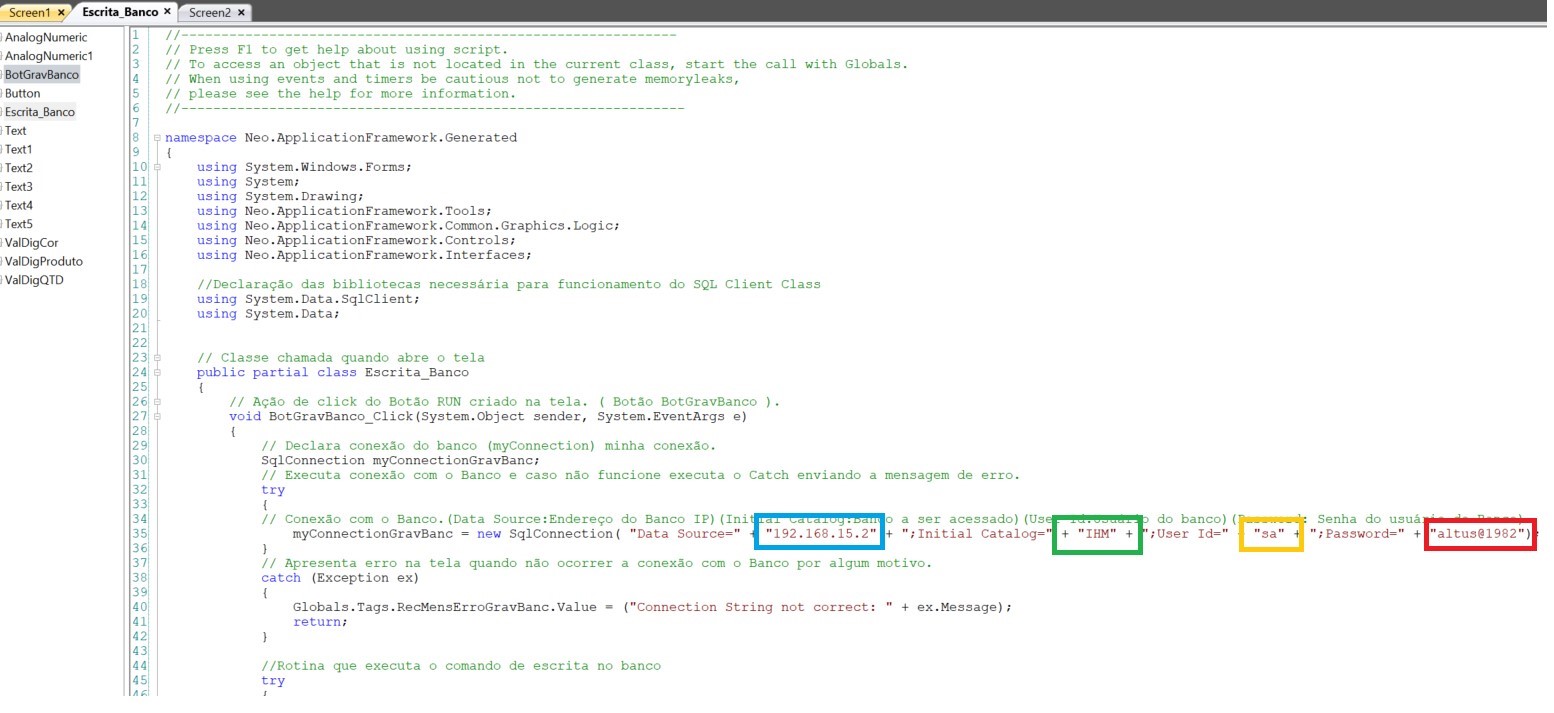Os itens marcados em vermelhos abaixo nesse script tratam-se dos nomes dados nos objeto Numérico Analógico como demostrado acima, pois quando você escrever o valor no objeto na tela o mesmo irá parar no item de conexão do Banco.
