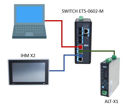 Na arquitetura deste tutorial , conectou-se a porta Ethernet do computador na porta Ethernet 1 do switch, a porta Ethetnet do transmissor de peso na porta Ethernet 2 do switch e a porta Ethernet da IHM na porta Ethernet 3 do switch.