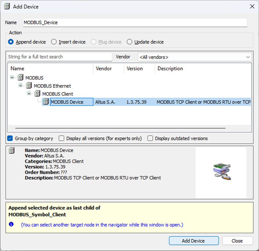 Irá abrir uma janela Add Device / Acrescentar Dispositivo. Selecione MODBUS à MODBUS Ethernet à MODBUS Client à MODBUS Symbol Client e clique em Add Device / Acrescentar.