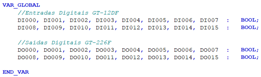 Crie variáveis para as entradas e saídas de acordo com os módulos de expansão. Como estamos utilizando módulos que possuem 16 entradas digitais e 16 saídas digitais, serão declaradas 32 variáveis booleanas para representação das mesmas
