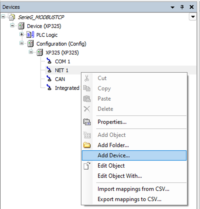 Na árvore de equipamentos, clique com o botão direito do mouse em NET 1, dentro de XP325 (XP325), e clique em Add Device... / Acrescentar Dispositivo....