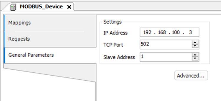 Abra o MODBUS Device que foi adicionado ao projeto e, na guia General Parameters, configure o endereço IP e porta TCP do dispositivo (Módulo GL-9089). Verifique o manual do Adaptador GL-9089 o procedimento para alteração de IP.