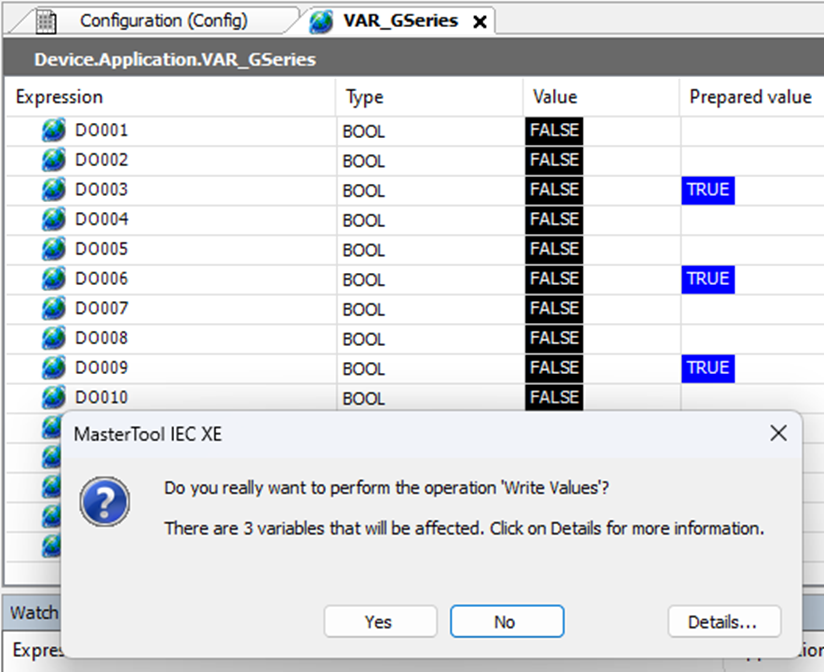 Para teste do módulo de saídas digitais, iremos utilizar a página de monitoramento das variáveis, que representam as saídas digitais, e na coluna Prepared value, podemos alterar o status das vaiáveis desejadas. Neste tutorial iremos deixar ativas as saídas 3, 6 e 9, conforme Figura 8. Pressionar Ctrl+F7 e clicar em Yes / SIM para carregar os valores na CPU.