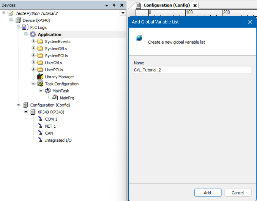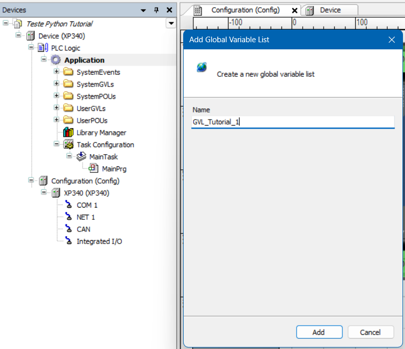 Para demonstrar isso, vamos criar um projeto uma GVL que chamaremos de GVL_Tutorial_1.