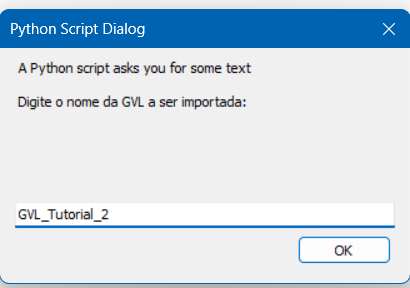 Após rodar o script, a primeira caixa de diálogo solicita que o usuário informe o nome da GVL na qual você deseja importar as variáveis. Importante notar que este nome não se refere à GVL da exportação, e sim à GVL do projeto novo, onde você quer importar as variáveis, e não precisa possuir o mesmo nome. Nesse caso, como criamos a GVL_Tutorial_2, digitaremos esse nome e clicaremos em OK.
