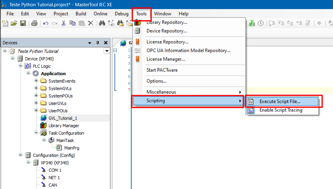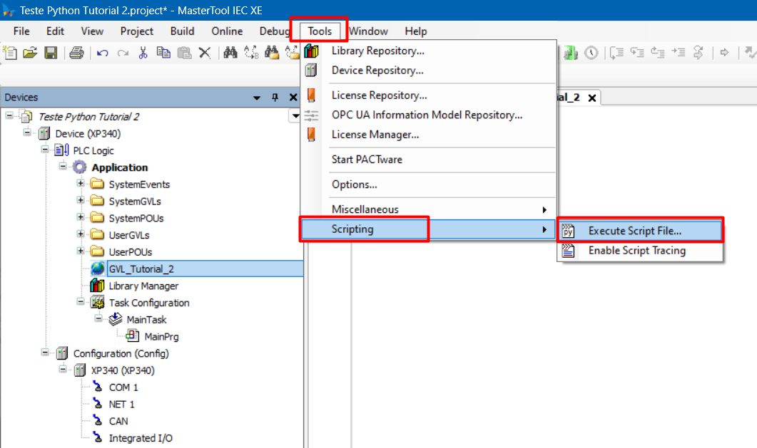 A função de Scripts em Python foi adicionada nas versões de MasterTool IEC XE 3.50 e superiores, e fornece uma maior liberdade de controle do seu projeto e CLP. Neste tutorial, iremos mostrar um exemplo de scripts em Python com a função de exportar e importar GVLs, facilitando a transferência das variáveis entre projetos.