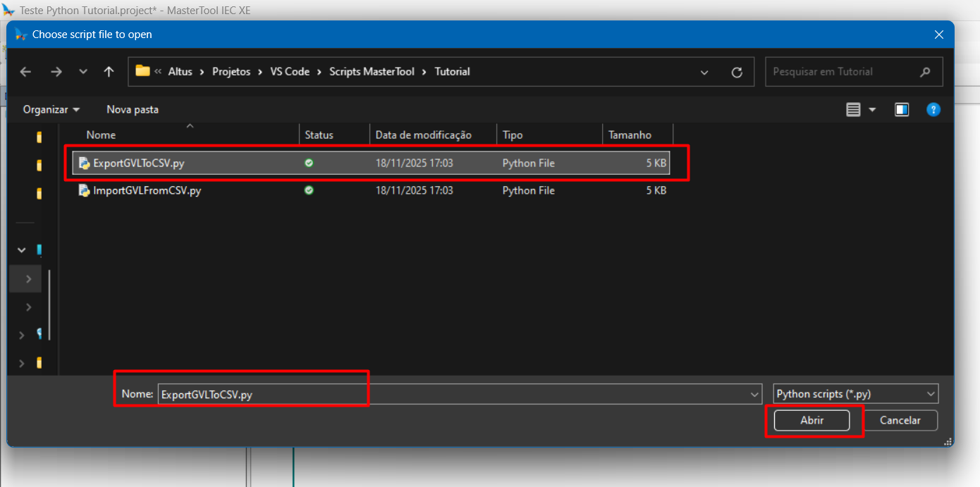 Na tela do explorer aberta, vamos selecionar o arquivo de script desejado, ExportGVLToCSV.py, e apertar em Abrir.