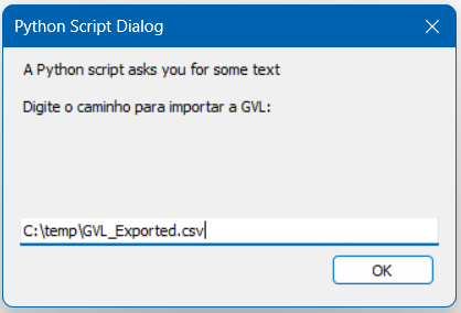 Após indicar a GVL, o usuário terá que indicar o caminho na qual o arquivo CSV se encontra. Caso o endereço seja diferente do padrão, digite-o na caixa de texto abaixo. Após garantir que o arquivo se encontra no caminho indicado, aperte em OK.