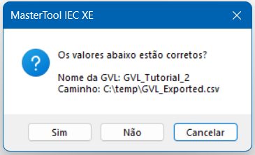 Após digitar o nome da GVL e apertar em OK, uma nova tela de Dialog é aberta, agora solicitando que o usuário digite o caminho desejado para exportar o arquivo CSV com as variáveis da GVL que indicamos anteriormente. O programa já escreve um caminho padrão para facilitar o processo para o usuário. Caso deseje outro endereço ou outro nome de arquivo, você pode alterar na caixa de texto e apertar em OK.