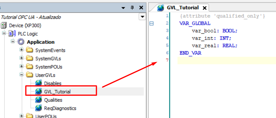 Neste tutorial, iremos criar um projeto com o CLP XP300, e iremos criar uma GVL chamada GVL_Tutorial, onde serão armazenadas as variáveis a serem comunicadas.