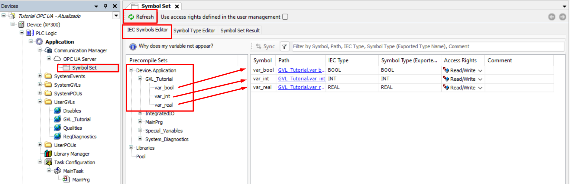 Com o refresh, irá carregar as variáveis disponíveis para a comunicação. Na pasta Symbol Set, podemos achar as nossas variáveis declaradas.