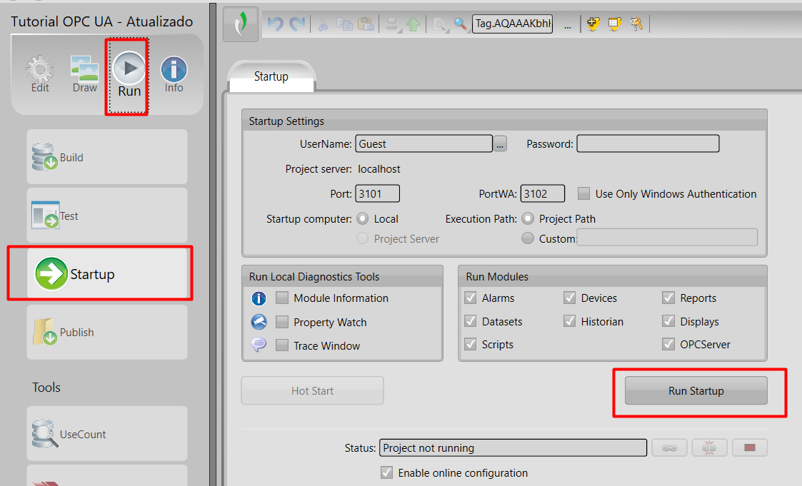 Para isso, você pode seguir outro tutorial na nossa base de conhecimento que explica o processo de criação de um projeto com essa configuração no seguinte link: Tutorial OPC UA BluePlant.