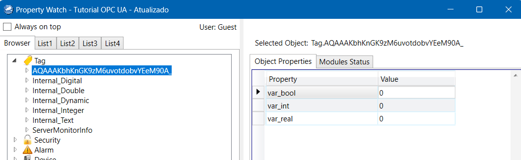 Nela, você pode abrir a variável criada pelo OPC, e monitorar e alterar os valores das variáveis criadas. Iremos demonstrar um exemplo de escrita e um exemplo de leitura.