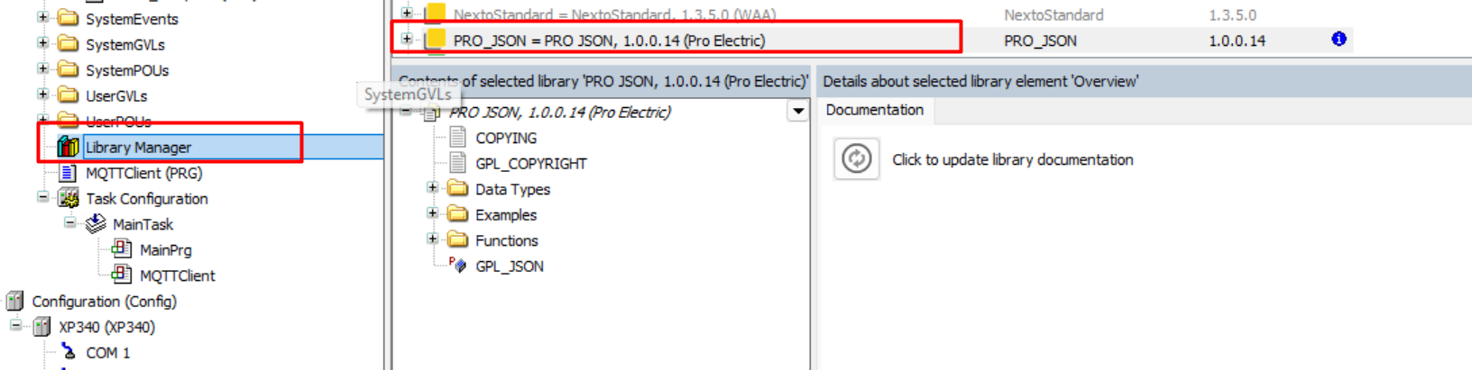 Para ver o conteúdo da biblioteca, você pode abrir o Library Manager no projeto baixado, e procurar pela biblioteca PRO_JSON.