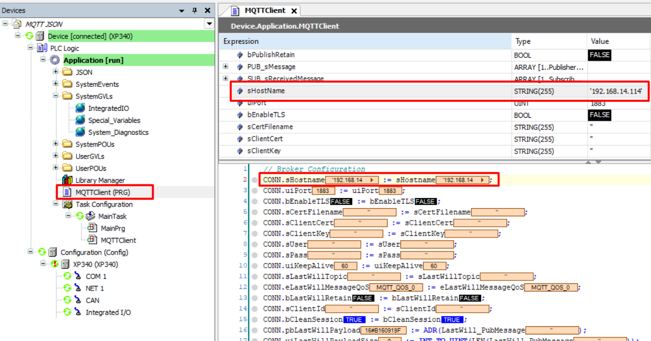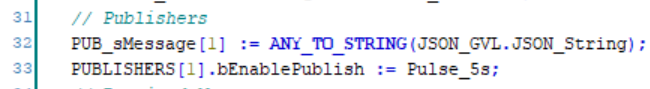 Na linha 32, definimos a mensagem a ser publicada: a string gerada pelo bloco de função que formatou as variáveis em JSON. Na linha 33, definimos o valor de bEnablePublish como Pulse_5s como um exemplo de acionamento da variável que ativa o envio da mensagem MQTT.
