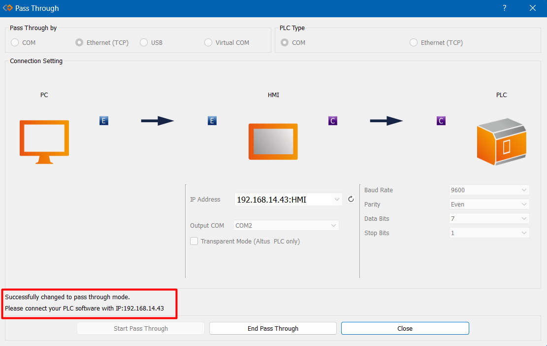 Se houver sucesso, a IHM estará agora em modo Pass Through, e você poderá acessar o CLP por meio do IP da IHM (192.168.14.43).