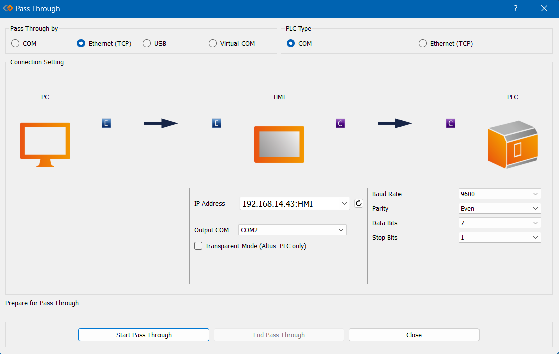 Na tela aberta, primeiramente devemos selecionar os modos de comunicação. Na primeira opção (Pass Through by) definimos como o computador está conectado com a IHM.