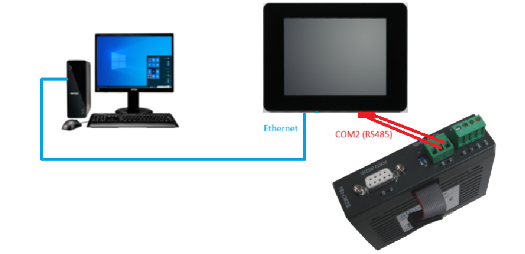 Para utilizar o Pass Through para se comunicar com o FBs, iremos conectar o computador com a IHM por meio de um cabo Ethernet, e conectar a porta serial da IHM (COM2) com a porta RS485 do módulo de expansão FBs-CM25E.