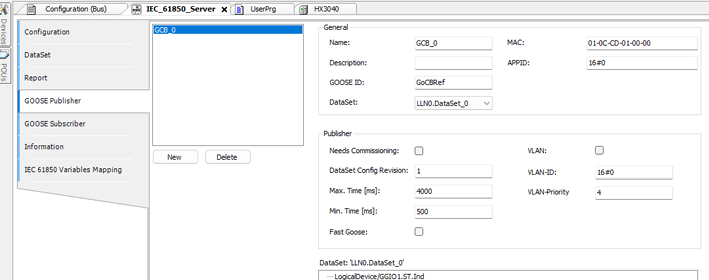 - Crie um GCB (Goose Control Block) e associe-o ao Dataset criado anteriormente.