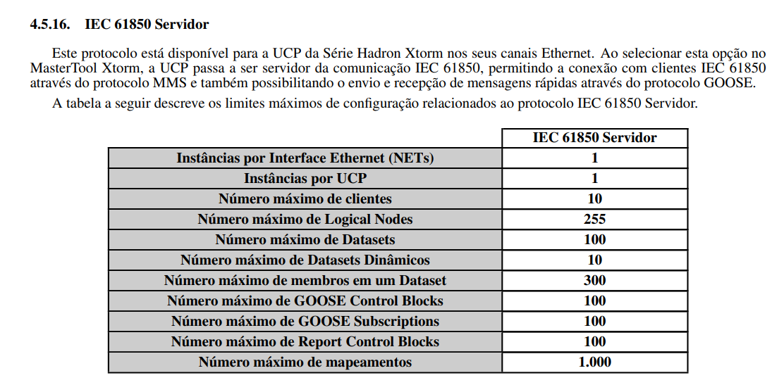 Observação: Como indicado na tabela abaixo do manual da Xtorm, o IEC 61850 Server possui um número máximo de 1000 mapeamentos, além de outros limites.