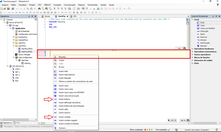 Com o UserPrg aberto, o próximo passo é inserir os elementos básicos da linguagem Ladder: o contato e a bobina, ambos acessíveis pelos mesmos menus e atalhos.
