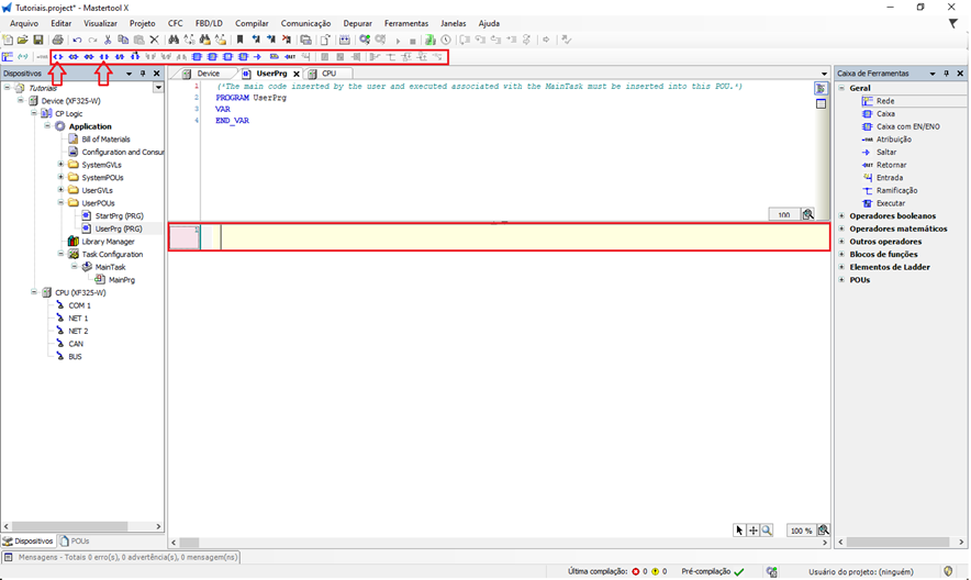 - Com a Network 1 selecionada, utilize a barra superior do MasterTool IEC XE.