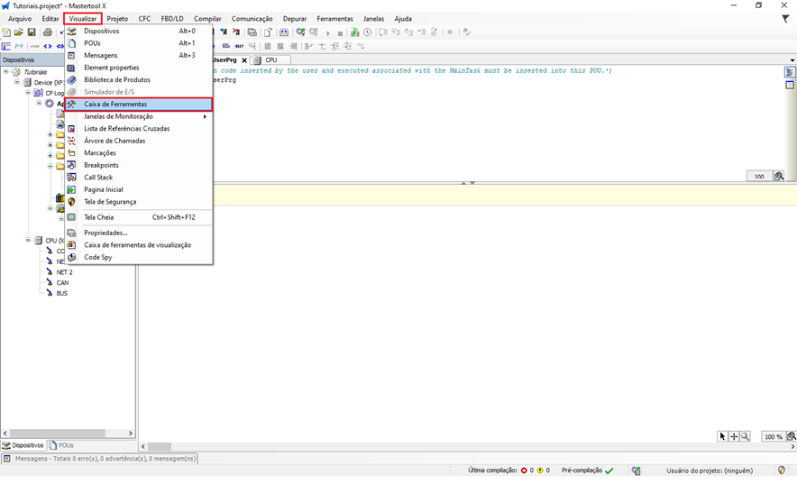 Dependendo do idioma configurado no MasterTool IEC XE, os comandos podem aparecer como: