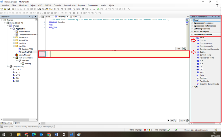 - Na caixa de ferramentas, selecione a aba Elementos de Ladder.