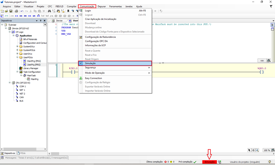 Com o projeto já criado e a lógica implementada, o próximo passo é habilitar o modo simulação, que permite executar e testar o programa em um CLP virtual, sem a necessidade de hardware físico.