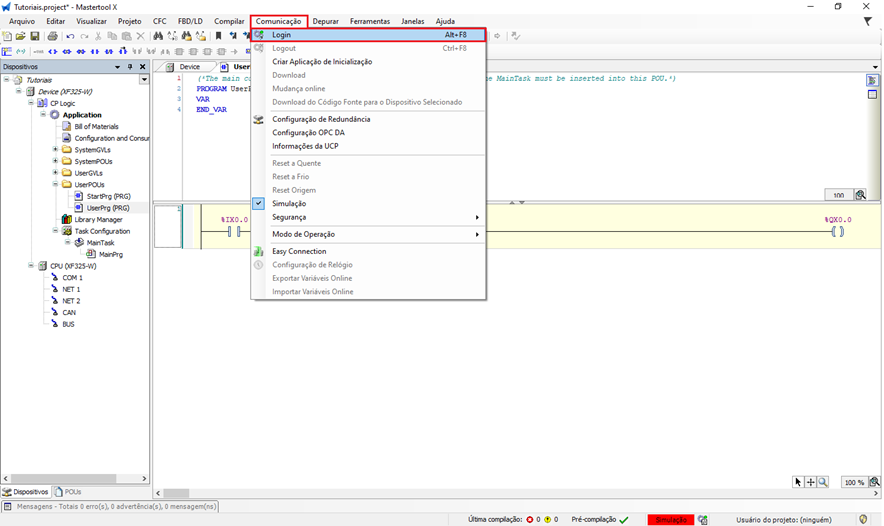 Com o modo simulação habilitado, volte novamente ao menu Comunicação e clique em Login. Esse comando realiza o download da aplicação para o CLP virtual.