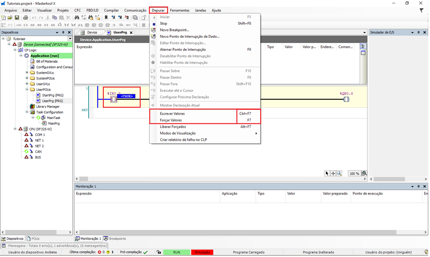 Sempre verifique se não existem valores forçados antes de iniciar uma nova simulação ou antes de transferir o programa para um CLP real.