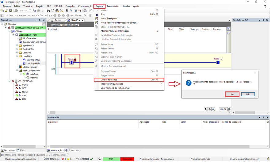 Figura 8. Comando de liberar valores forçados no CLP em modo Simulação