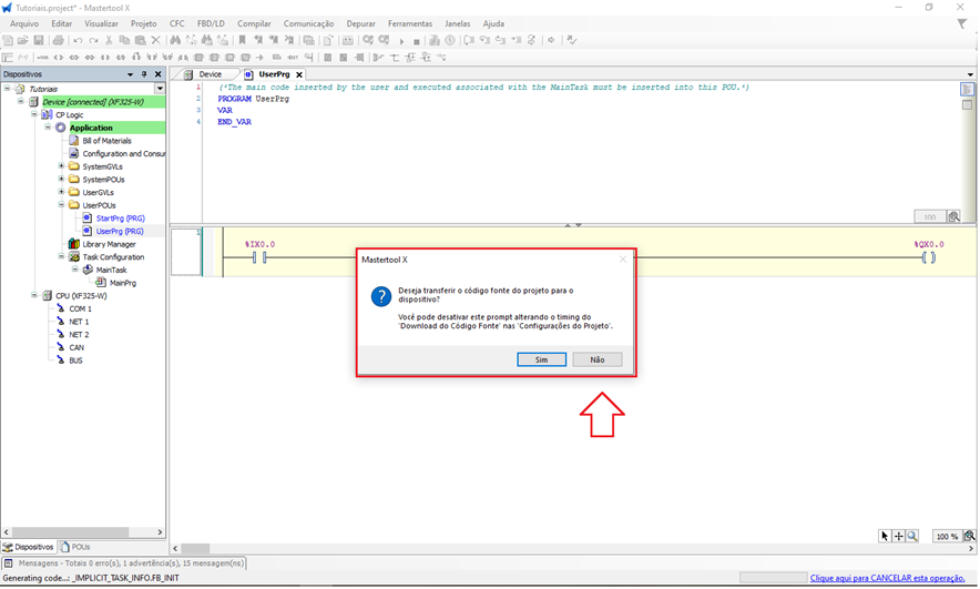 Nesse momento, o MasterTool IEC XE irá compilar o código, verificando se existem erros de sintaxe ou de lógica. Caso algum erro seja encontrado, o software exibirá mensagens indicando o problema para correção.