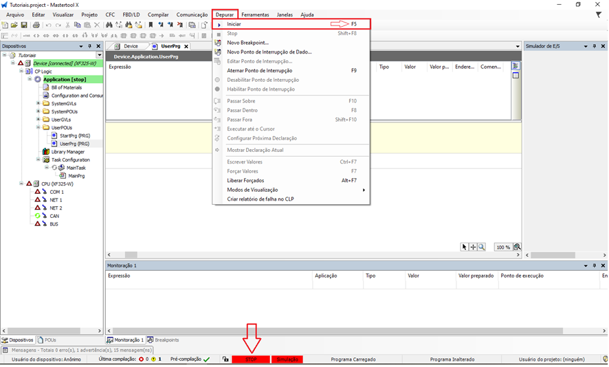 Após a compilação e o login, o software iniciará com a CPU em modo STOP, que é o estado padrão de segurança.