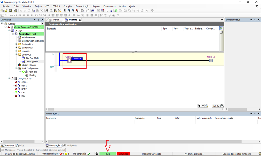 - Utilize o atalho localizado no canto superior do software para colocar a CPU em modo RUN.