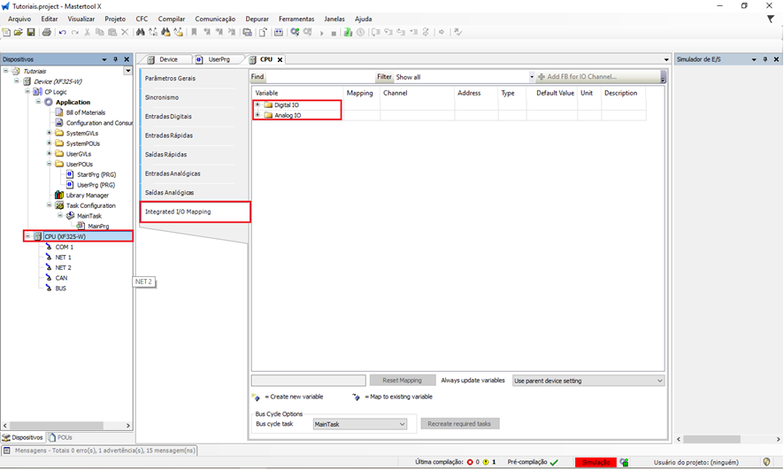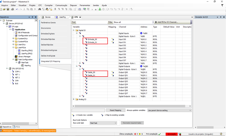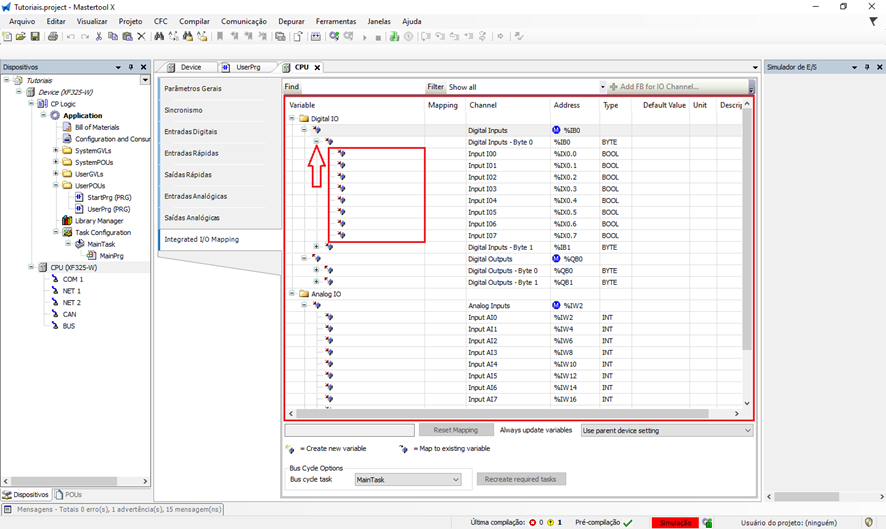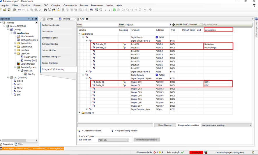 Para facilitar a leitura, manutenção e entendimento do programa, é possível vincular nomes simbólicos aos canais de entradas e saídas integradas do CLP, tanto digitais quanto analógicas.