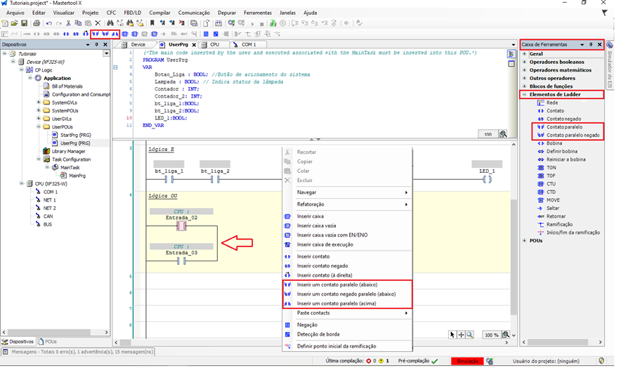 O objetivo deste tutorial é demonstrar a inserção de contatos em paralelo para montar uma lógica OU em um projeto do MasterTool X.