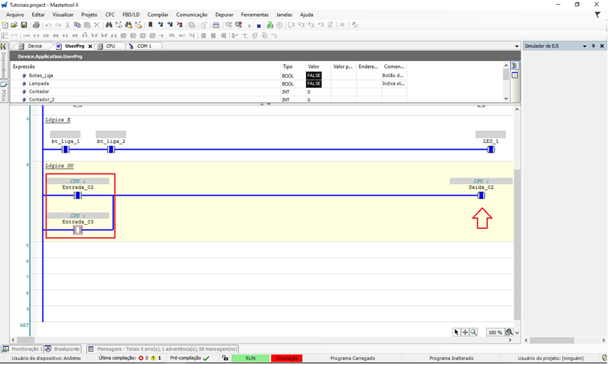 Para isso, faça o login no projeto e coloque a CPU em modo RUN. Com o programa em execução, o usuário pode manipular as variáveis associadas aos contatos, seja pela lógica Ladder ou pela tabela de variáveis, alterando seus valores para verificar o funcionamento da lógica OU (OR).