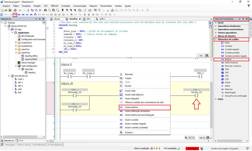 Clique com o botão direito do mouse sobre o contato ou bloco existente e selecione Inserir Contato Paralelo Abaixo. - Caixa de ferramentas (lateral direita da tela):