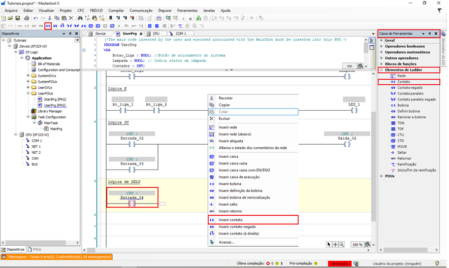 Acesse a aba Elementos de Ladder e selecione e arraste para a linha do código Contato. - Atalho de teclado: