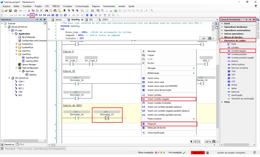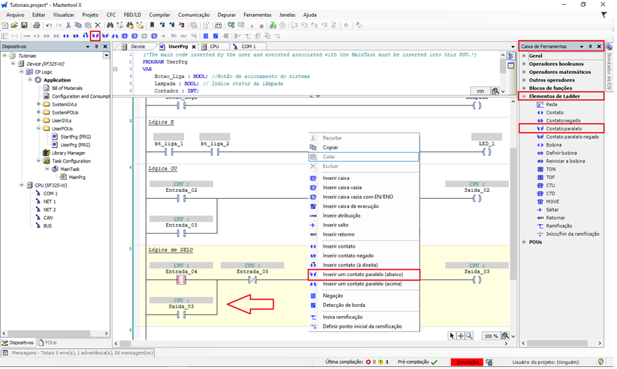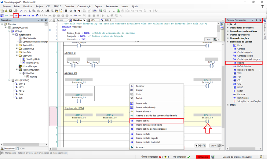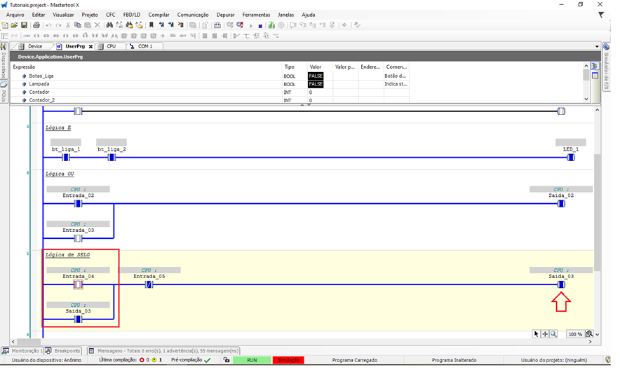 - Observe o comportamento da bobina e do contato de selo na lógica Ladder.