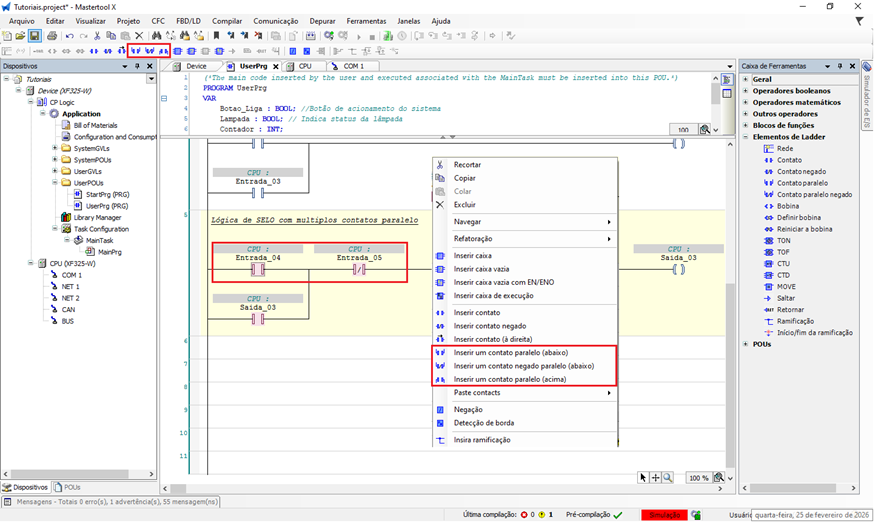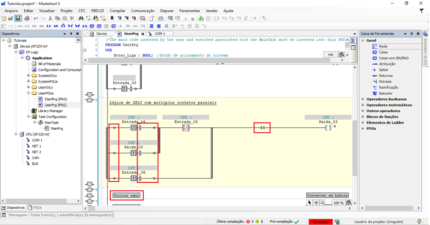 Em aplicações mais complexas, é comum utilizar uma lógica de selo com múltiplos contatos em paralelo, permitindo que diferentes condições mantenham a mesma saída acionada. O MasterTool IEC XE oferece recursos que facilitam tanto a inserção de contatos paralelos em relação a vários objetos quanto a reorganização da lógica já criada.