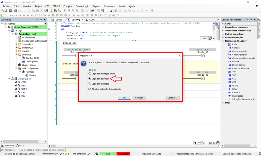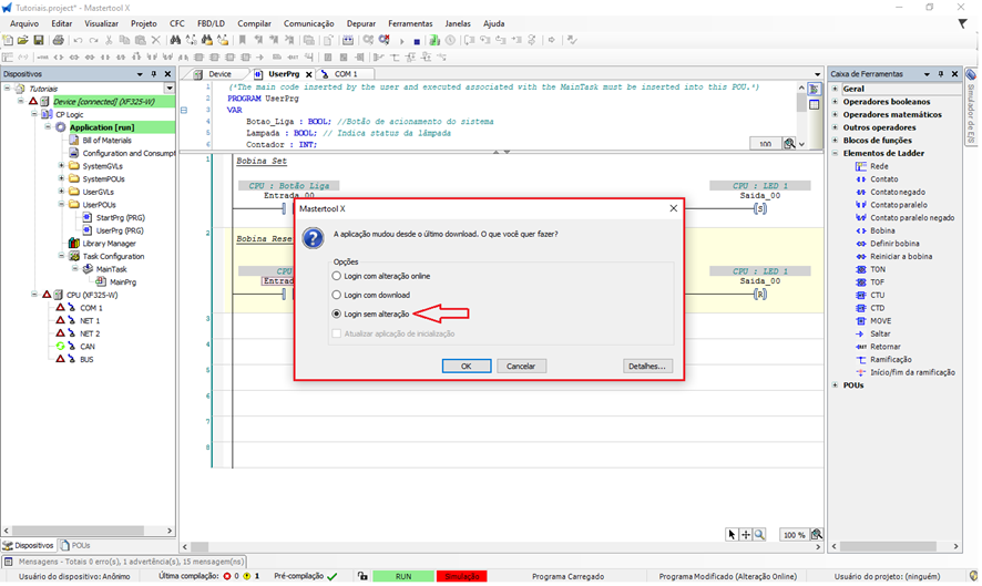 Quando o projeto sofre alterações desde o último download e o usuário executa o Login, o MasterTool apresenta uma janela perguntando como a aplicação deve ser enviada ou sincronizada com o CLP. Cada opção tem um comportamento específico em relação ao estado da CPU e ao código em execução.