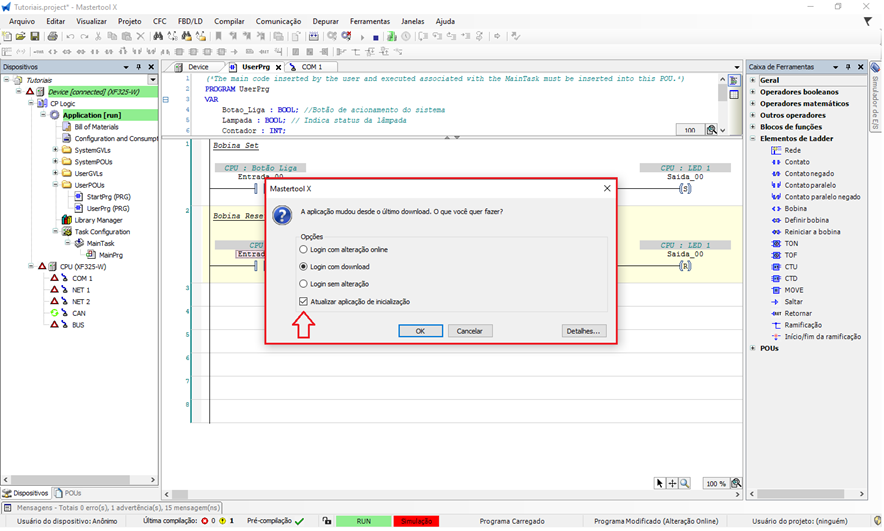 - Atualizar aplicação de inicialização: define o código que será carregado ao ligar o CLP